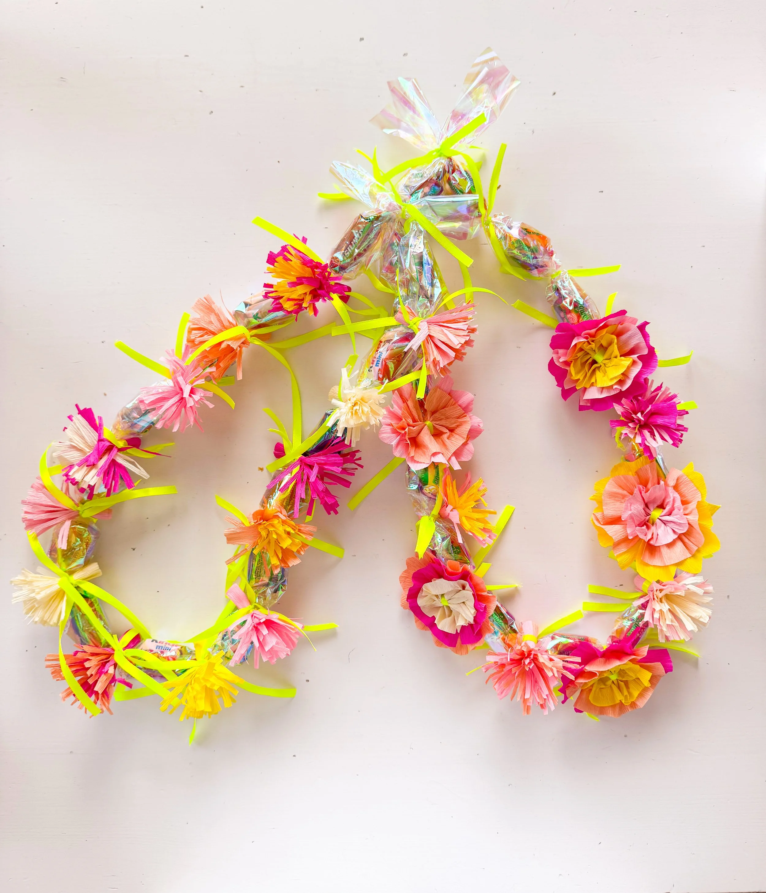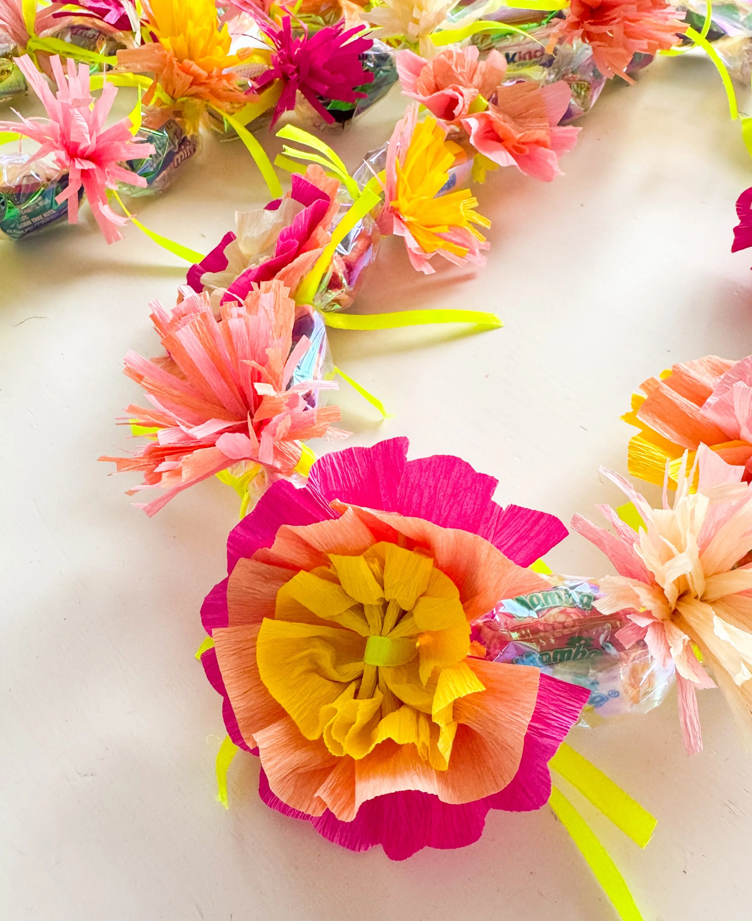 For my daughter’s graduation, I knew I wanted to do something special to recognize all of her hard work! Candy leis and necklaces are so cute, but I thought I could make make one with a little more pizzaz! I stumbled upon @OhHappyDay’s candy leis on Pinterest, and I knew they were the perfect thing! Using crepe paper flowers in the best colors, this flower and candy necklace is truly unique.